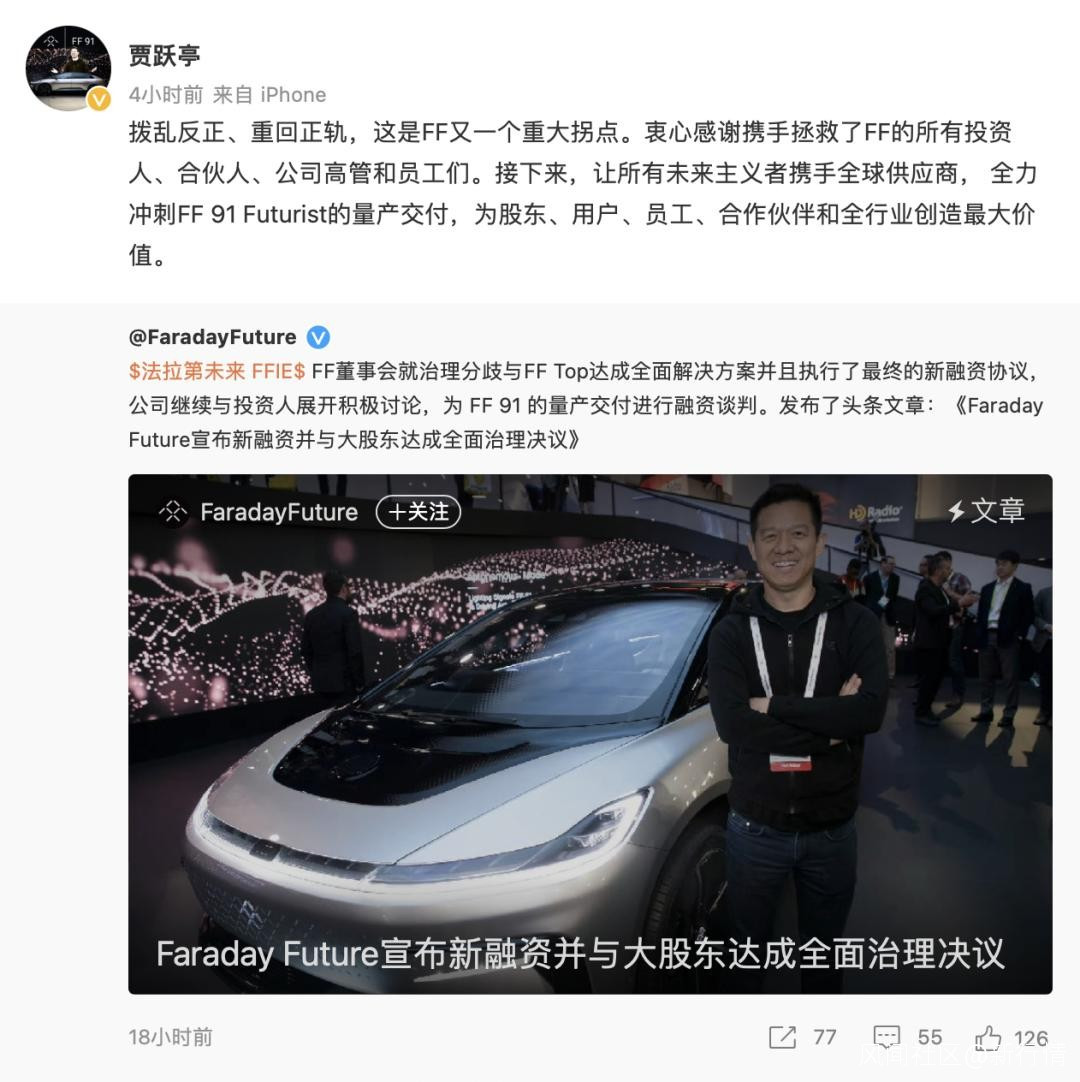 隨後,久未露面的賈躍亭在社交媒體發聲:“撥亂反正、重回正軌,這是FF又一個重大拐點。衷心感謝攜手拯救了FF的所有投資人、合夥人、公司高管和員工。”