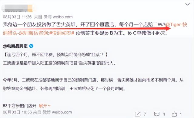 經銷商加盟意向不強烈,門店拓展速度慢,某種程度來看,也跟舌尖英雄的口碑有關,從消費者的反饋來看,跟瑞幸咖啡早期 “低價精品”的噱頭來比,舌尖英雄的產品確實沒有什麼爆點。從好吃的角度來看,大部分消費者都表示舌尖英雄的出品非常一般,這跟其採用代工模式進行生產有關,將出品“假手於人”,穩定性往往難以把控。此外,長達1-3年的保質期也被消費者吐槽“不新鮮”。從方便的角度來看,消費者則認為速烹菜的料理並不比自己做飯省事,比如一道水煮肉片,舌尖英雄的速烹菜只是將材料分切好,最終還要自己解凍、下鍋、燜煮,跟加熱即食的預製菜還是不一樣。從服務質量來看,由於當前網點數量不多,舌尖英雄的配送根本做不到宣傳的3分鐘,而是需要40-60分鐘,不少區域甚至只能次日達。價格、品質和服務,舌尖英雄哪一個優點也不沾,再加上當前品牌擴展速度放緩,全國門店數量不多的背景,舌尖英雄雖然算是最早一批打造全國連鎖的預製菜品牌,卻沒能為後來者提供什麼經驗,自然也無法像瑞幸一樣創造“神話”。2加盟商持續虧損趣店羅敏曾在直播中號召寶媽們加入預製菜開店隊伍,並稱只要每天賣出50份菜,寶媽們每月便可輕鬆賺大幾千的收入,那麼加盟預製菜門店到底是不是一門好生意?舌尖英雄已經悄悄交出了一份答卷。據Tech星媒體報道,一位在今年3月加盟的經銷商,至今仍在虧錢。這位經銷商給自己算了一筆賬,在開業之前,他大約花了23萬,包括設備、貨品、預付租金以及1-3萬元不等的加盟費。據舌尖英雄的官方預估,網點經銷商每個月能賺6萬元,可該經銷商卻表示,門店的單日營業額平均只有800元左右,按官方宣傳所説的50%毛利率來算,每個月的毛利只有1.2萬元,遠低於店鋪的人員、租金等支出。