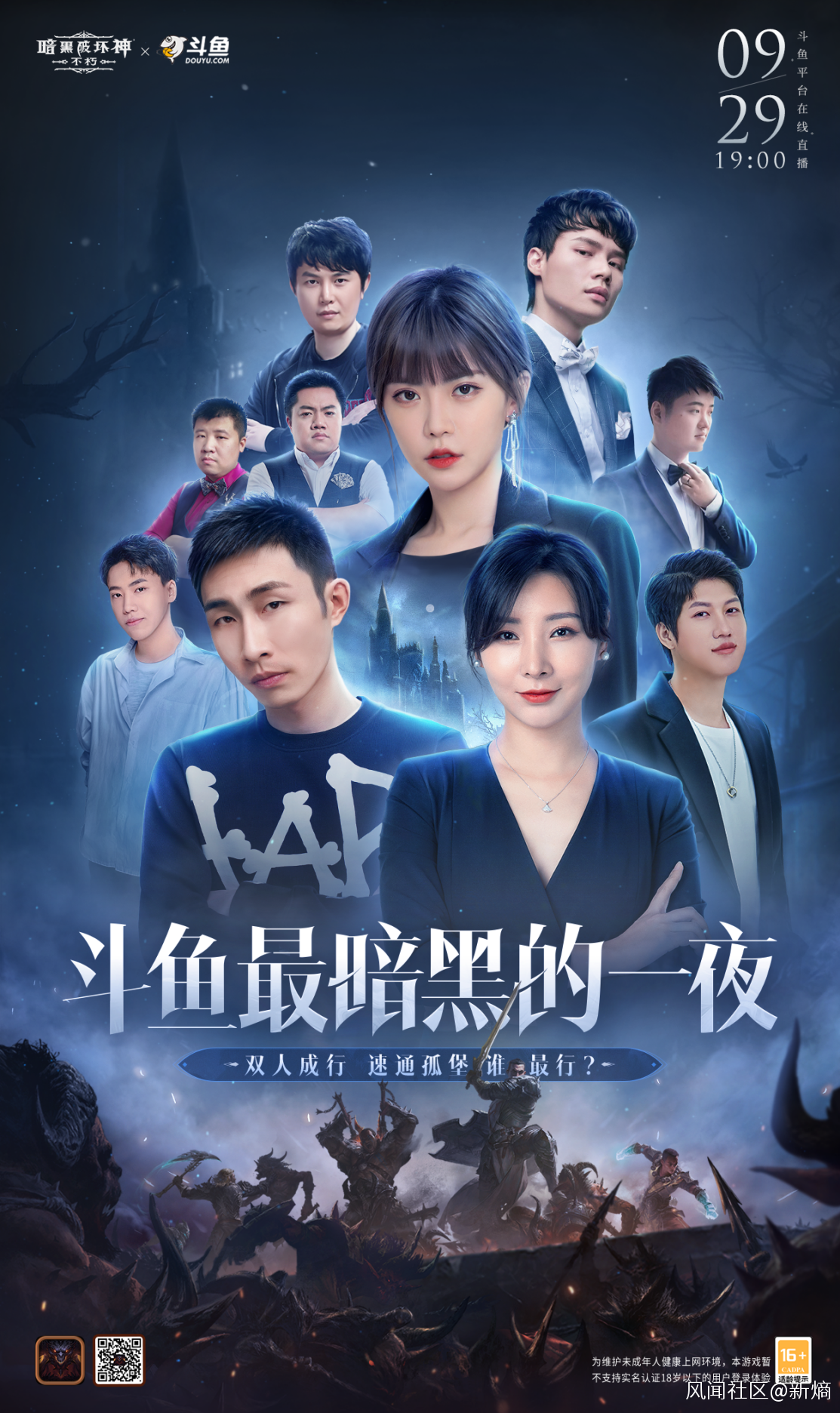9月29日今晚19點《暗黑破壞神:不朽》將攜手由寅子、周淑怡、女流等人氣主播組成的奈非天戰團集結鬥魚直播間,兩兩組隊開啓非凡冒險,實機體驗此次上線的全新玩法和副本,迎接來自詛咒古堡的冒險挑戰。更有星際老男孩孫一峯和黃旭東作為彩蛋組合,在今晚22點驚喜出戰。