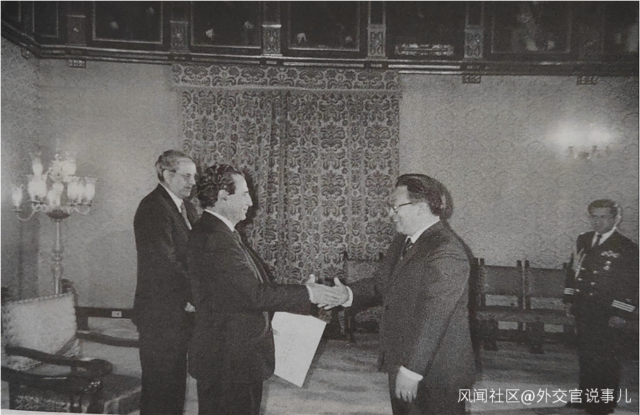 在總統府二樓的黃廳,也叫“大使廳”的中央,博爾哈總統由一位副外長陪同等着我的到來。我在使館政務參贊湯銘新、經商參贊俞世茂的陪同下走上前去,將國家主席楊尚昆簽署、國務委員兼外交部長錢其琛副署的國書遞交給博爾哈總統。博爾哈總統雙手接過我的國書,微笑着同我握手致意,隨後邀請我們到黃廳旁側的另一個稍小點的廳裏談話。