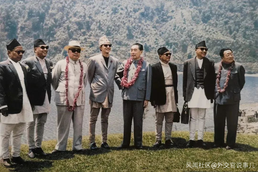 1960年4月,陳毅副總理兼外長陪同周恩來總理訪問尼泊爾。圖為柯伊拉臘首相(左四)陪同遊覽博克拉湖。