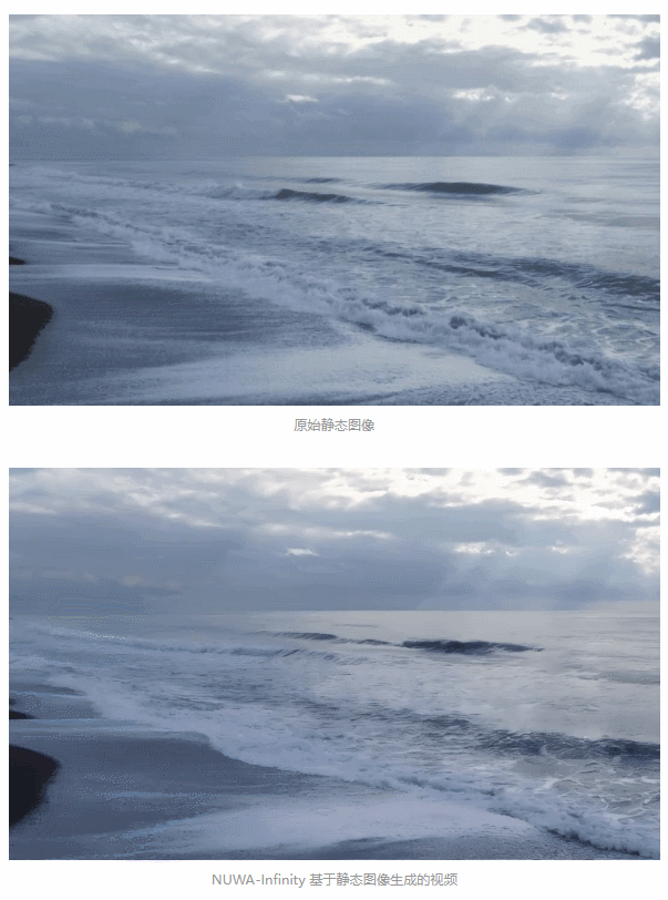 微軟亞洲研究院提出的NUMA,可以基於給定的文本、視覺圖等素材生成圖像或視頻,還可以進行圖像補全、視頻預測等等。在此基礎上,微軟亞洲研究院將其升級為NUMA-Infinity,可以生成任意大小的高分辨率圖像或長時間視頻。