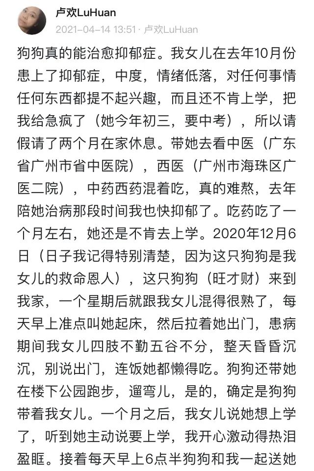 網友@盧歡説,**狗狗真的能治癒抑鬱症。**女兒初三時得了抑鬱症,吃什麼藥沒用,也不肯上學。後來,養了狗狗旺財,它每天帶女兒下去遛彎。短短一個月,女兒的情緒有所改善,並決定重返校園。