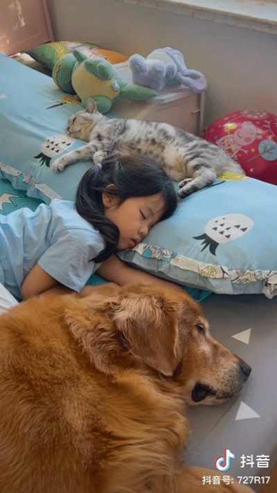 它們會在小主人睡覺時,一前一後陪在身邊,給足安全感;