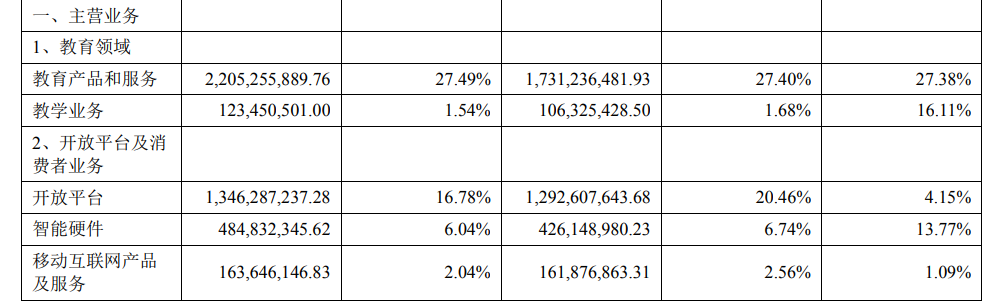 儘管從營收份額上看,比重最大的教育業務並未與其他拉開較大差距,但考慮到懸殊的毛利率對比(52.16%,領先第二位23個百分點),教育營收無疑撐起了飄紅的利潤。