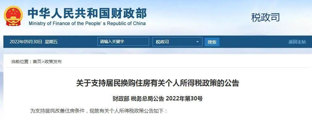 財政部、税務總局:對居民出售自有住房並1年內購房的 售房已繳個税予以退税優惠