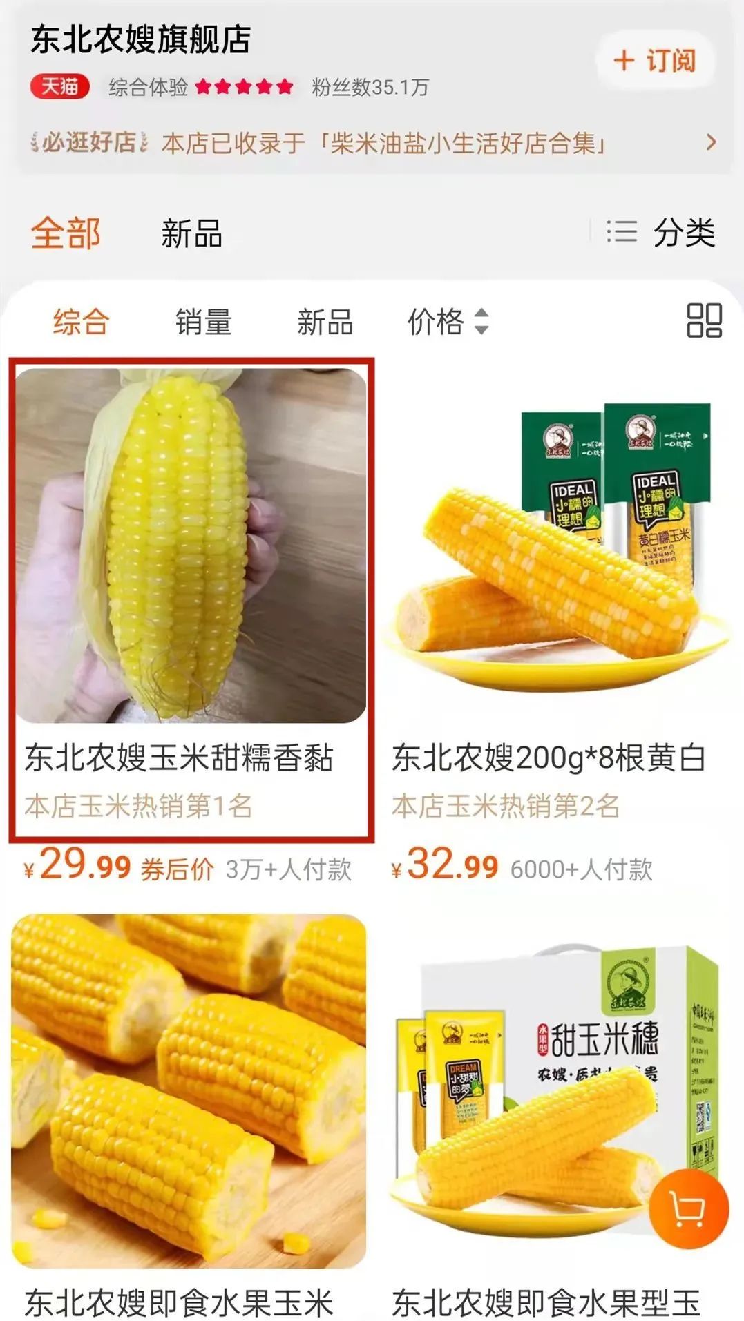 近日,東方甄選的玉米供應商吉林省東北農嫂食品公司,在自家的短視頻賬號上開售東方甄選的同款玉米,價格僅為3.6元一根。