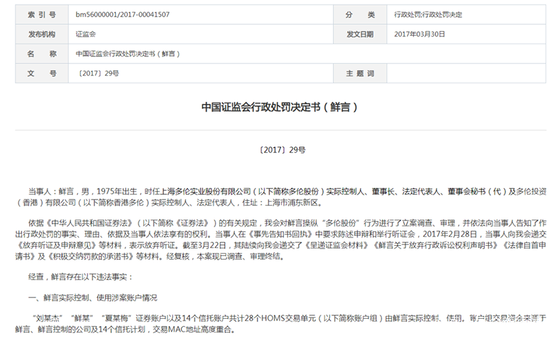 2014年1月17日至2015年6月12日期間,鮮言通過採用信息優勢、資金優勢、持股優勢連續買賣,在自己實際控制的證券賬户之間交易、虛假申報等手段,操縱“多倫股份”交易價格和交易量,非法獲利超過5.78億元。