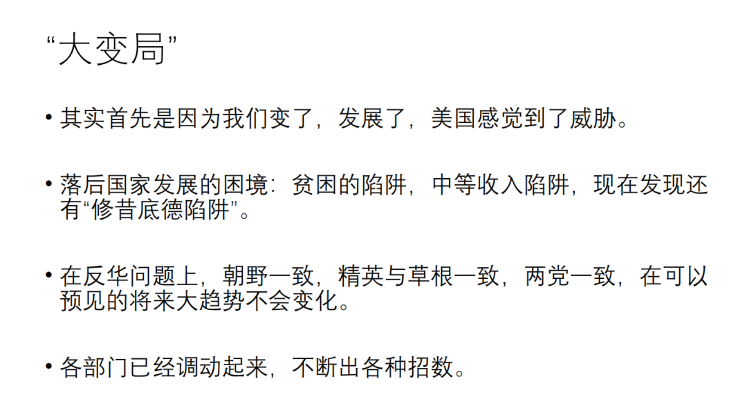 **説這幾個陷阱都是屬於有規律性的,不可避免。****修昔底德陷阱就是崛起的大國和守城大國之間必然發生摩擦和衝突,最壞的結果是打熱戰,好的結果打貿易戰、技術戰。**技術戰是從後發優勢朝着自我創新的過程,是相當艱苦、漫長的過程,現在美國逼着你,要切斷你發揮後發優勢的渠道,不跟你交流、給你斷供,不允許企業間和科學界進行交流,“卡脖子”的事情就要發生,都是在技術領域,某種意義上不可避免。**貿易戰、技術戰再發生十幾二十年,才能解決合作上的問題。**今後我們會看到美國的各個部門都會出招,美國的體系還是很有效率的,我總説美國在國際上是不講規矩的,叢林法則,但是國內的一套規矩還是在運行,不斷的產生新技術、革命性顛覆性的商業模式,我們要有思想準備。