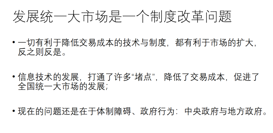 **要認識到的問題是發展統一大市場是制度改革問題,技術能起到一定的作用,一切能有利於降低交易成本的東西都有利於擴大市場都有利於形成統一大市場。**前一段我們有賴於互聯網技術,電商一下子打破了很多環節,地方保護、產品不讓賣、中間的批發環節,通過B2C越過很多的環節、打掉了很多堵點。所有的交通環節,我們的基礎設施改進,基礎設施的改進、交通的便利加上信息的便利都是降低交易成本,從而都能擴大市場使得市場更加統一。**剩下的制度性問題值得高度重視,包括中共中央的制度、地方政府的制度,還是有很多堵點的,**包括是不是允許和鼓勵其他地區的產品進入,招標、競標過程中是否一視同仁,對於新的業態在本地區的發展,是不是能夠一視同仁的面對各種新業態的發展,不適當的干預、地方的保護、妨礙准入退出等,都是現在需要改變的制度。通過制度的改變來擴大市場,確保我們市場的統一性、一致性。