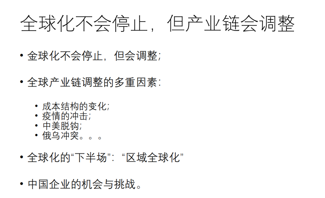 從企業的角度看這也是我們的機會,不要想着全球化是不是去中國化,把產能從中國轉移出去,我們的很多企業也是跨國公司,也會朝着跨國公司的方向發展,要在全球佈局產業鏈,這可能是我們的機會。