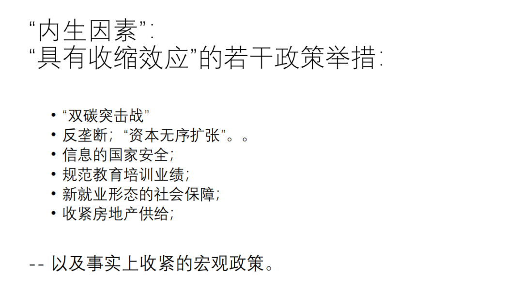 **“內生因素”是從自己的體系中、經濟活動中產生的,主要是去年三季度之後集中出台的,後來被中財辦確定有收縮效應導致合成謬誤的政策。有些措施不是不採取,而是看如何採取。**比如説低碳、追求雙碳目標、低碳轉型,持續戰打成殲滅戰就導致了拉閘停電。反壟斷也要反、資本無序擴張也要反,但是一下子把頭部企業,所謂有壟斷傾向的企業造成巨大的衝擊,**這些企業是不是壟斷、怎麼壟斷還沒有搞清楚。**比如説壟斷,壟斷首先得有一定的市場份額,在國內市場有份額,國際市場的份額應當怎麼看,特別是互聯網,互聯網沒有邊界,因此是競爭、是壟斷要在國際視野分析這個問題。我們跟國際上比,我們的營業額很小。現在判斷壟斷要看是不是可競爭的,**如果是可競爭的就不是壟斷的,這個在國際上判定壟斷問題時是非常重要的概念,我們沒有做這方面的分析。**什麼叫做可競爭的?去年拼多多在短短幾個月的時間裏把最大電商的營業額搶走了百分之幾十,這就是可競爭的。去年以來大的企業增長乏力,原來國際上的市值都是領先的,“獨角獸”數量也是領先的,結果現在落後很多。加上其他國家信息安全,國家信息安全要保護,涉及到一些企業,企業的增長有了停滯。