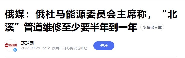 按照俄羅斯天然氣協會主席、俄杜馬能源委員會主席扎瓦利內的説法,修復“北溪”管道可能至少要半年到一年。