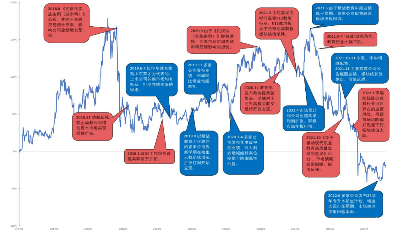 過去五年的絕大部分時間,板塊整體估值水平的下挫或者上升主要由政策的變化驅動。這由民辦教育特殊的公益屬性所決定——民辦教育的辦學資質、招生、學費等核心環節都會受到較嚴格的監管。如2018年8月《民促法實施條例(送審稿)》和2021年7月課後輔導板塊“雙減”政策等,均帶來估值的重挫並造成股價的大幅下跌;而2020年5月《關於加快推進獨立學院轉設工作的實施方案》出台帶來估值提升。