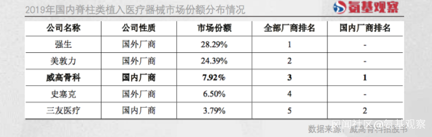 一直以來,醫療器械領域都是海外大藥廠占主導地位。如下圖所示,2019年國內脊柱類植入器械市場,佔據主導地位的強生和美敦力市場份額超過50%。