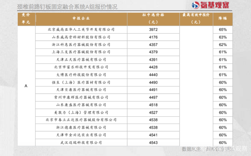 如下圖所示,在頸椎前路釘固定融合系統A組的報價中,入局者的報價極為接近。