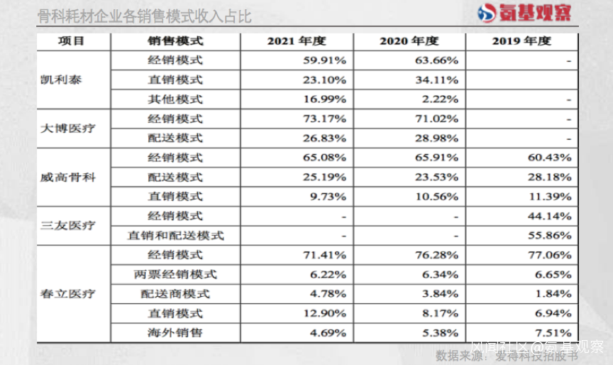另一方面,集採降價還會間接影響出廠價。骨科耗材國內外企業均採用經銷商模式銷售。如下圖所示,2021年包括大博醫療、凱利泰、愛得科技在內的公司,經銷收入佔比均不低。