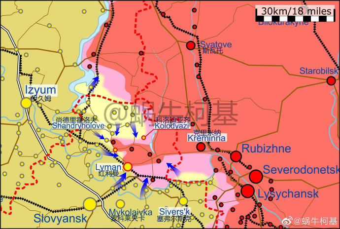 ➖烏克蘭武裝部隊從北部的科洛迪亞齊村一側和南部的北頓涅茨河岸橋頭堡兩頭對進,即將在基羅夫西克-托爾斯克合攏對紅利曼的包圍圈。