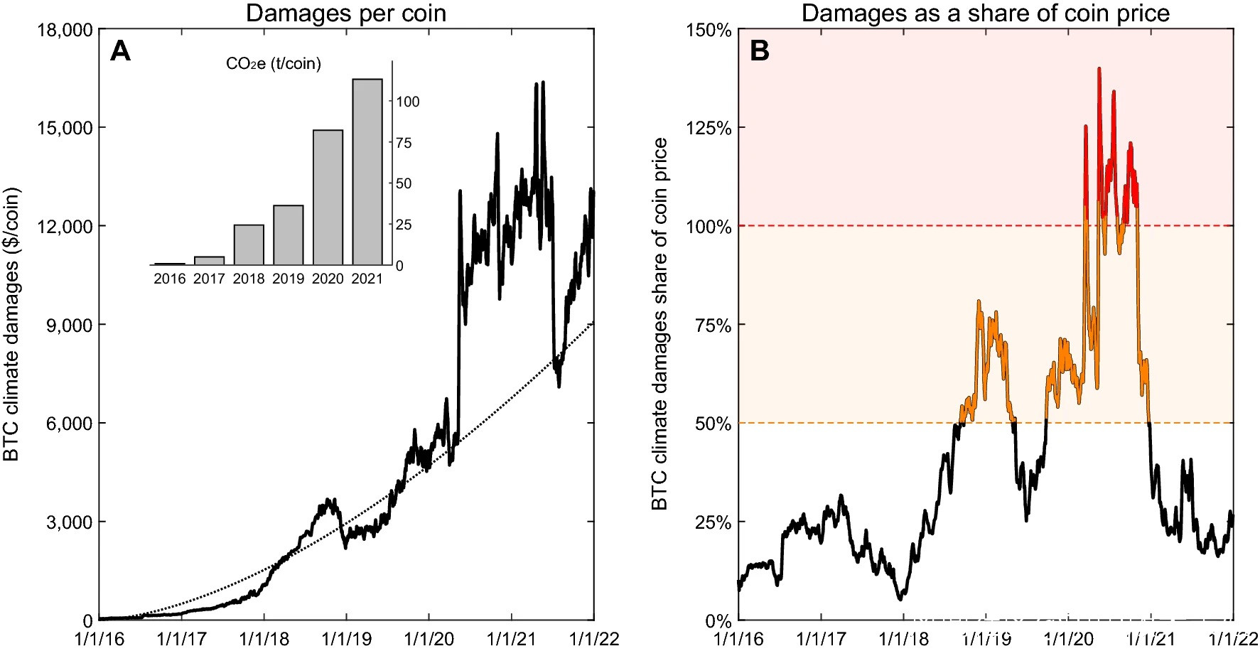 研究人員發現,比特幣挖礦的能源排放增長了126倍——從2016年的每幣0.9噸增加至2021年的每幣113噸。計算顯示,2021年每挖一個比特幣會產生11314美元的氣候損害。2020年5月損害達到最高,為幣值的156%,説明每1美元的比特幣市值會產生1.56美元的全球氣候損害。