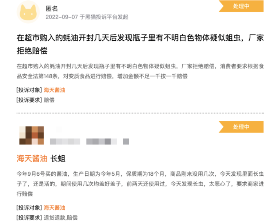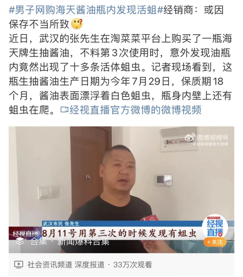 多次被曝光的生蛆事件,海天也是把鍋甩給消費者儲存不當,從未道過歉。