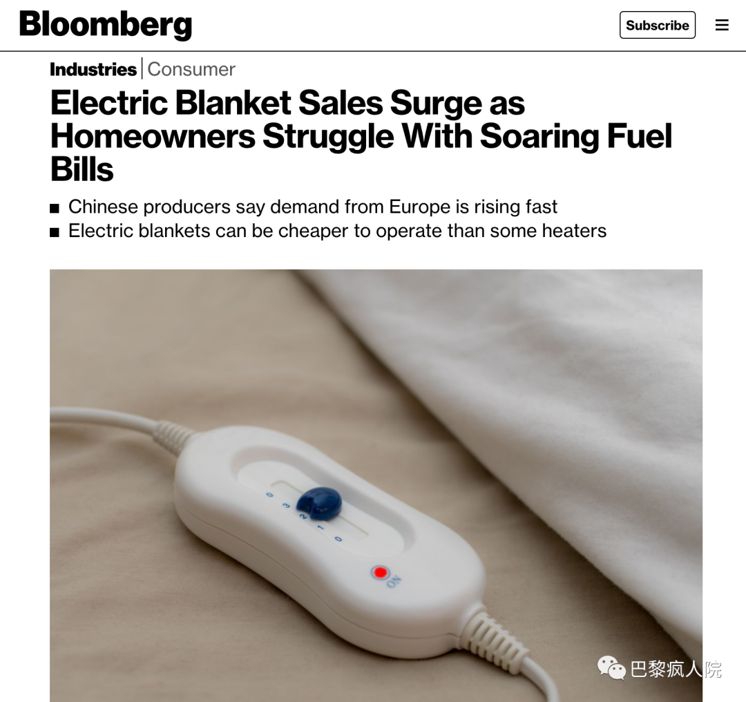 彭博社報道,電熱毯成了歐洲人民抵禦寒冬的“法寶”,銷量猛增!