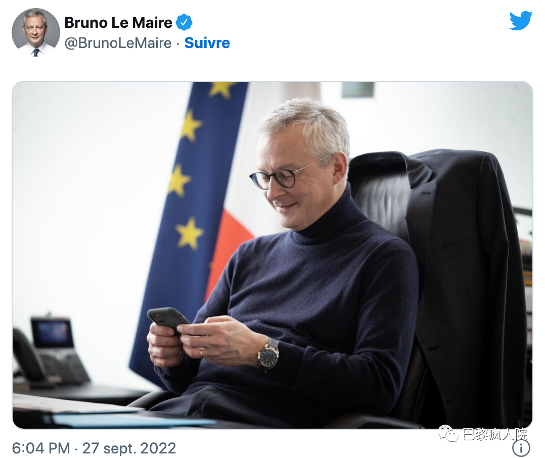 不只是總理,經濟部長也跟上腳步,一如既往地走“法式優雅”路線,沒穿羽絨服,選擇了高領毛衫: