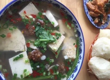 丸子湯也是遍佈回族餐桌的一道獨特佳餚,湯裏一般放有牛肉丸子、牛肉片、阿魏菇、菠菜、凍豆腐和粉絲等,葷素搭配,營養均衡,本地人最地道的吃法是一碗鮮香熱乎的丸子湯配上兩三個暄軟的油塔子。