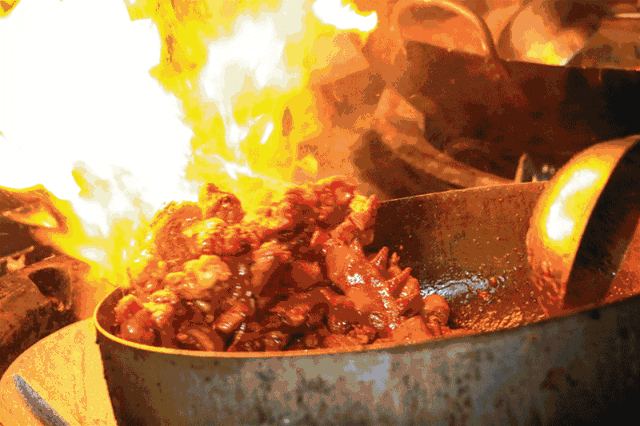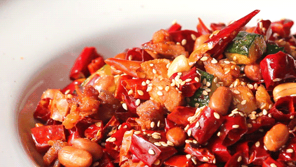 金黃酥脆有嚼頭的雞塊和乾紅油亮的辣皮子一同盛入大盤中,用花捲蘸上盤底滲出的紅油塞進嘴裏,入口皆是滿足!