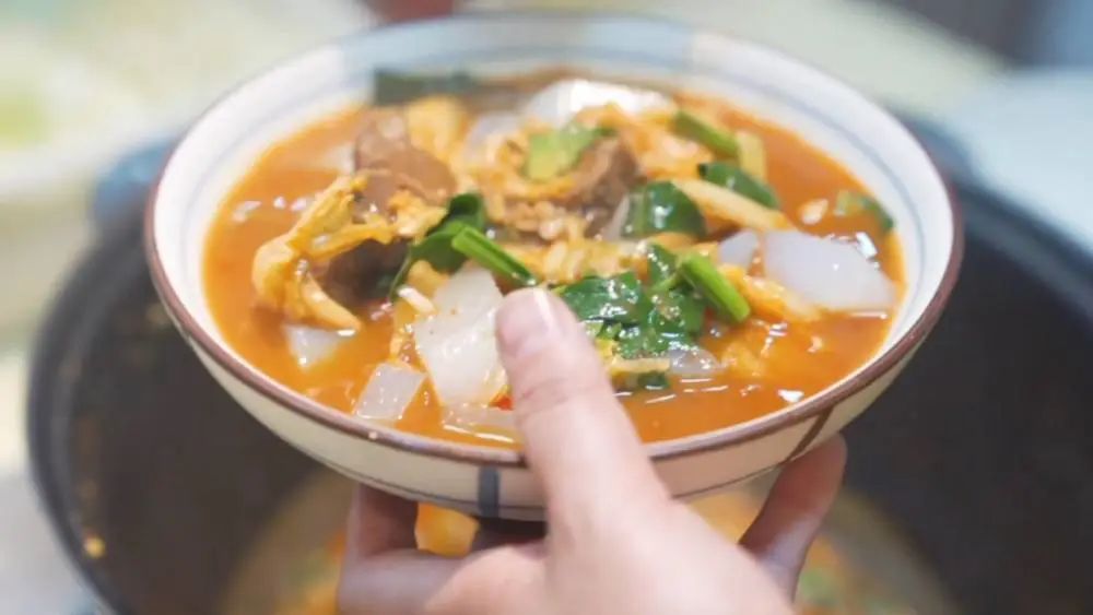 丸子湯以牛骨熬湯,湯底鹹香味美,牛肉丸子肉質鮮嫩可口,阿魏菇入口Q彈爽滑,咬開一塊凍豆腐,盡情享受湯汁迸濺的愉悦。