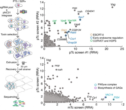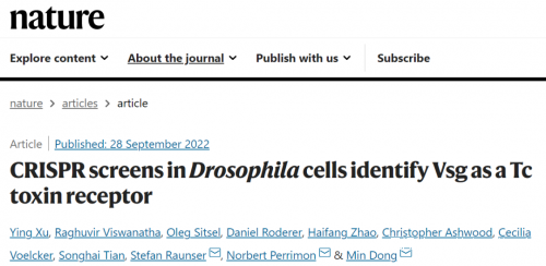 細菌蛋白毒素是很多致病菌的主要武器,例如白喉毒素,炭疽毒素,肉毒桿菌毒素等等。近年來,全基因組CRISPR/Cas9篩選技術在哺乳動物細胞上得到廣泛應用,成為研究這些針對人和動物的毒素和病原菌的主要實驗方法。昆蟲是地球上種類最繁多的動物,在整個生態鏈上起到至關重要的作用。在自然界中,存在許多專門靶向昆蟲的細菌蛋白毒素, 有些已經被廣泛地應用於農業害蟲防治 。現有的CRISPR-Cas9篩選技術依賴針對哺乳動物細胞的慢病毒轉染系統,不適用在昆蟲細胞上,大大限制了人們對針對昆蟲的蛋白毒素作用機制,抗性,宿主特異性以及開發新型殺蟲毒素等問題的研究。2022年9月28日,美國哈佛醫學院波士頓兒童醫院董民教授實驗室、哈佛醫學院Norbert Perrimon教授實驗室以及德國馬克斯·普朗克研究所Stefan Raunser教授實驗室合作,在 Nature 期刊雜誌發表了題為:CRISPR screens in Drosophila cells identify Vsg as a Tc toxin receptor 的研究論文。該研究在昆蟲細胞上首次利用CRISPR-Cas9篩選技術,找到了一種特異針對昆蟲的細菌蛋白毒素(Tc toxin)的受體。這一工作在分子水平上揭示了毒素的作用機理和對不同昆蟲的特異性,不僅建立了對這類毒素在自然界的功能的深刻理解,而且有助於將來進一步發展高效特異的生物殺蟲劑,用來控制農業害蟲和其他傳播疾病的昆蟲。