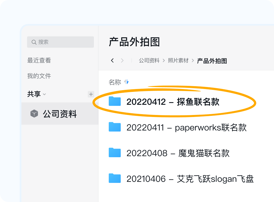 **最終他們選擇企業微信的“微盤”,每次拍攝的圖片,都在文件夾裏註明“拍攝時間+飛盤款式”,**運營同事可以隨取隨用。