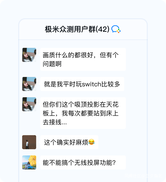 具體而言,這款將吸頂燈、投影和音響三合一的創新產品試產過後,極米就在“極友羣”裏遴選了部分發燒友進行試用。