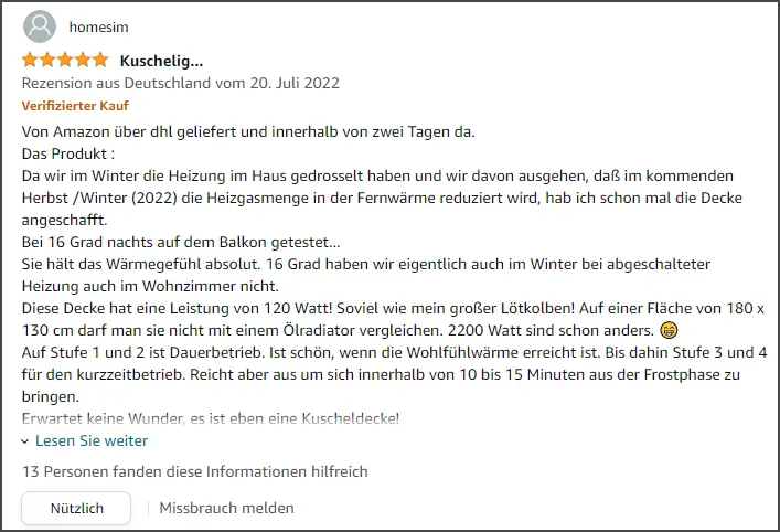 亞馬遜上一款銷量1700多的電熱毯評論區裏,一個德國買家表示站在16度陽台上迎風親測,效果絕佳。