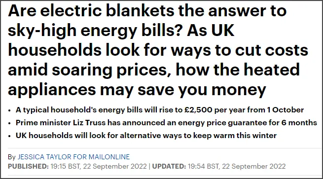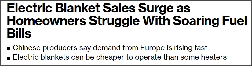最近彭博社一篇文章報道,因為天然氣費用猛增,歐洲人民頭越來越大,而隨之而來的增長還有電熱毯的銷量。