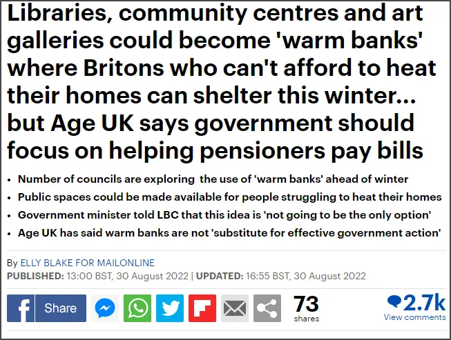 每日郵報上個月30號一篇報道説,英國正建議把圖書館等公共場所變成“温暖銀行”,讓在冬天付不起暖氣費的人們免費進去蹭熱度。