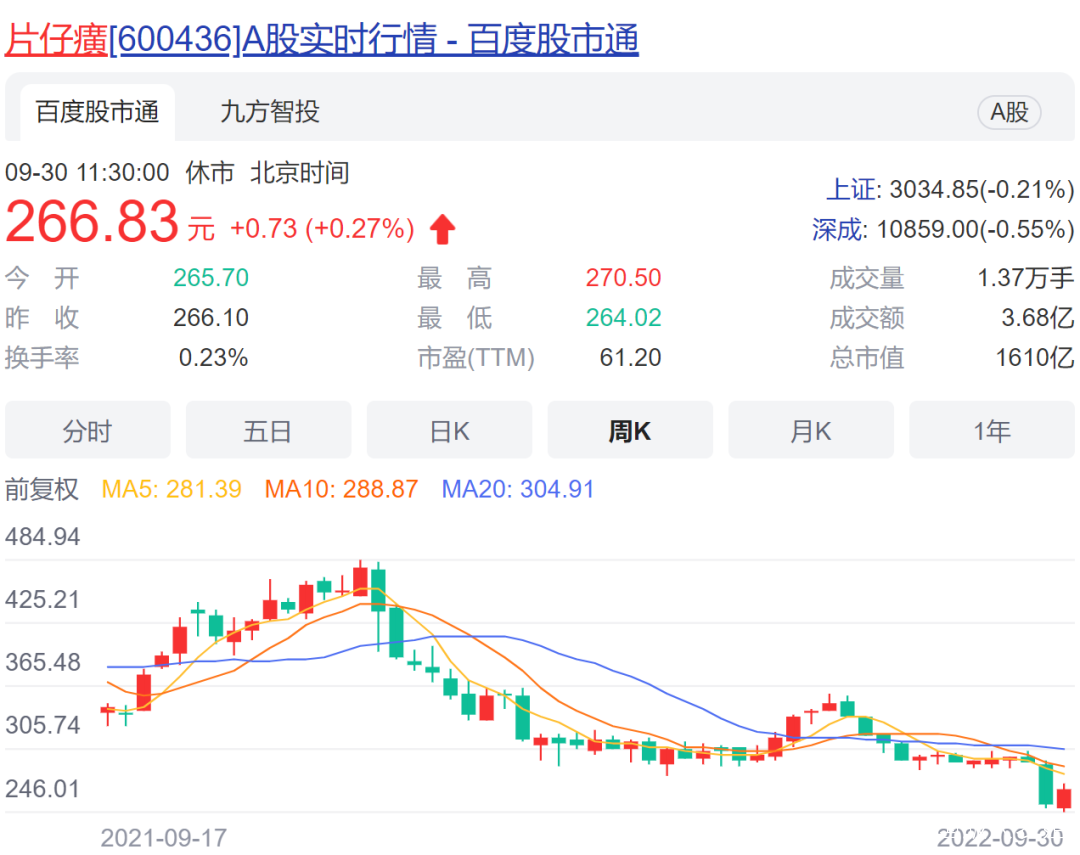 但隨着片仔癀居高不下的售價逐漸退燒,片仔癀股價開始顯著回落。9月22日,“藥中茅台”片仔癀全日大跌逾7%,引發市場關注。9月26日,片仔癀股價創下年內新低246.01元。wind數據顯示,今年以來,片仔癀的股價累計跌幅達39%,市值蒸發逾1000億元。