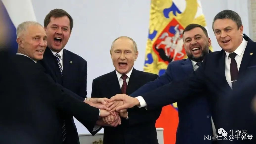 看照片和視頻,克里姆林宮很盛大的儀式上,普京簽字,他和四個地區領導人,五個大男人,手疊放在一起,場面非常熱烈。