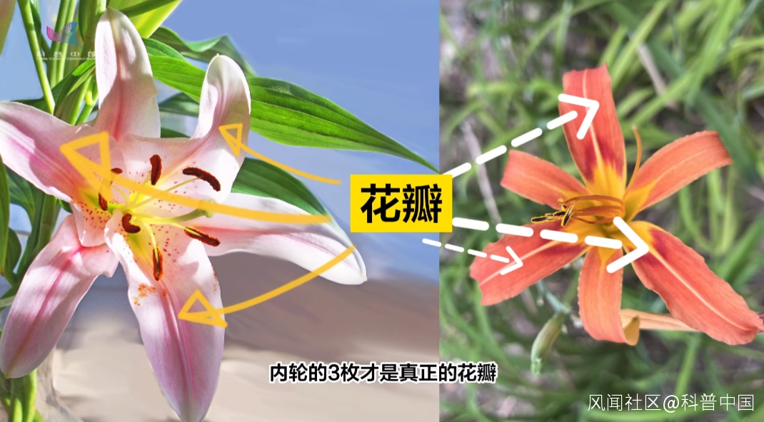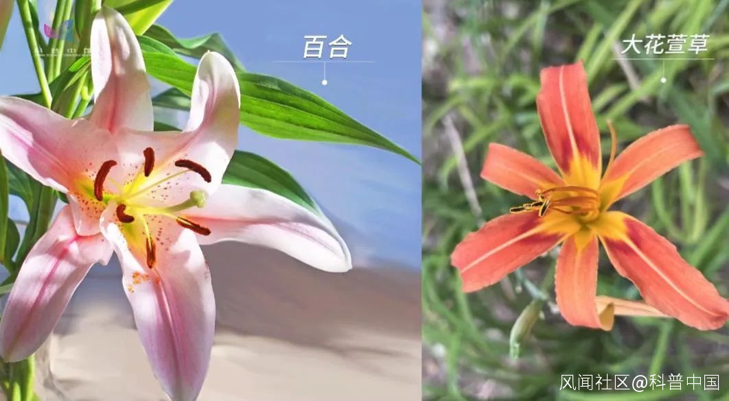 萱草和百合都有 6 枚花被片,分成兩輪,注意啊,這叫花被片,不能叫花瓣,如果從解剖學上看,內輪的 3 枚才是真正的花瓣,外輪的 3 枚其實是萼片。