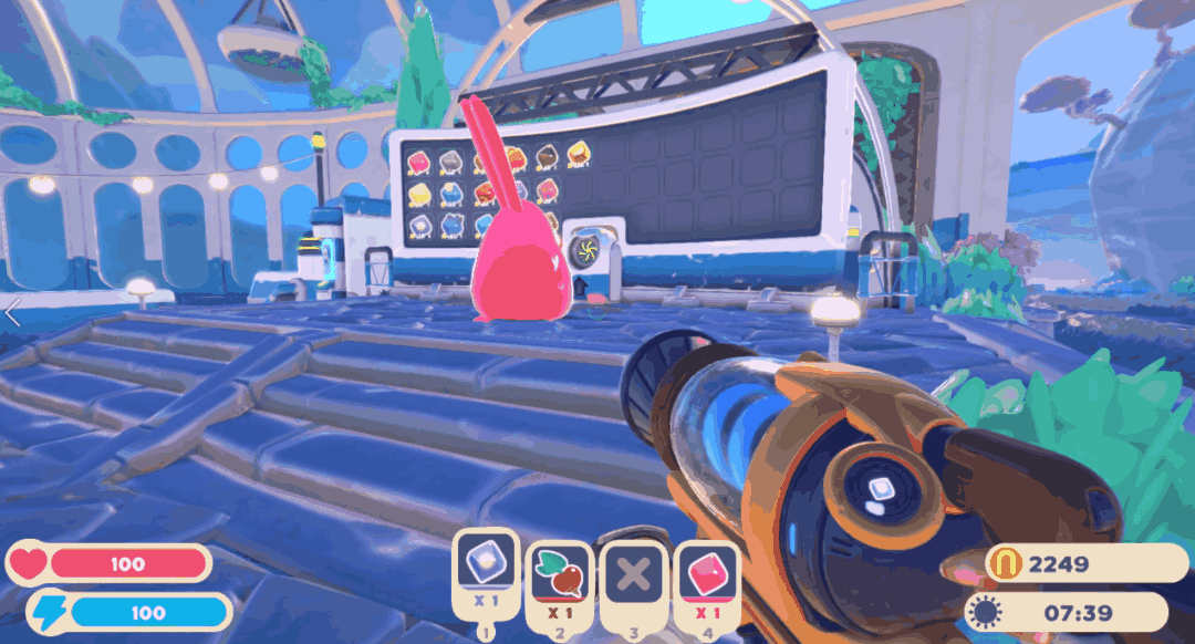 吃過食物之後的史萊姆,就會當場立即生產出結晶。我們再把結晶拉到温室裏的售賣展板,就能賣出一個好價錢了。