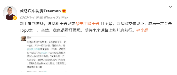 但沈暉可不開心了,他直接微博喊話王興,説威馬必然會成為 2020 年的 Top 3 之一。