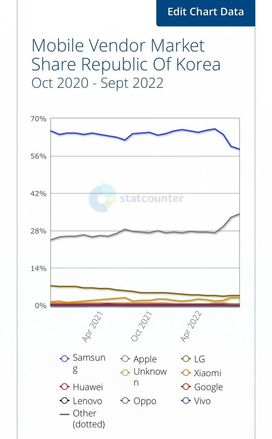 日前,根據國外Stat Counter 數據顯示,iPhone 在韓國智能手機市場中的份額持續提高,從 6 月的 27.28% 提高至 9 月的 34.1%。而三星的市場份額從 6 月的 66.11% 先後跌至 7 月的 63.98%、8 月的 59.47%,9 月跌幅繼續擴大,跌至 58.38%,三星首次在韓國國內市場份額跌破 60%。