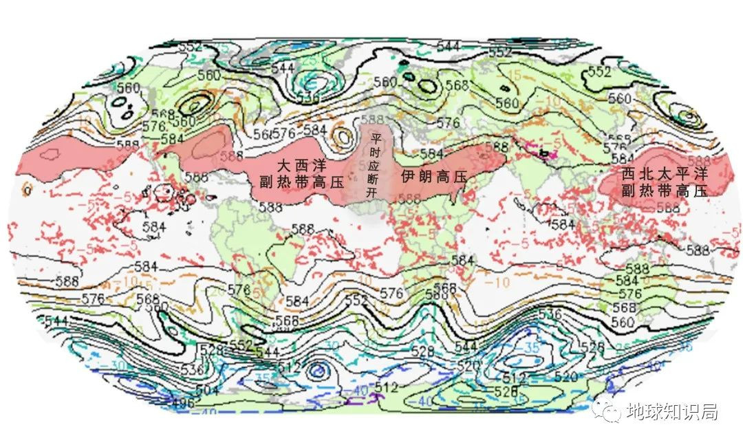 在北半球,由於青藏高原、地中海、落基山脈的阻隔,副高會斷裂成北太平洋副熱帶高壓帶、北大西洋副熱帶高壓帶、伊朗-北非高壓三個部分。