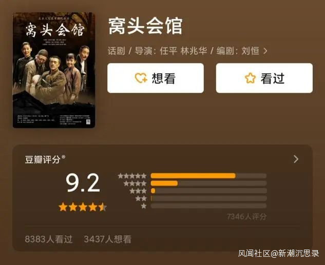其實,在人藝的話劇序列中,《窩頭會館》還未必算是一等一的絕世佳作,導演林兆華甚至直言“這不是戲,是宣傳”,自己根本就不喜歡,但這並不能阻止觀眾為了買票連夜排隊、貢獻超過千萬的總票房,連一貫嚴格的豆瓣上也給出了9.2的超高分。