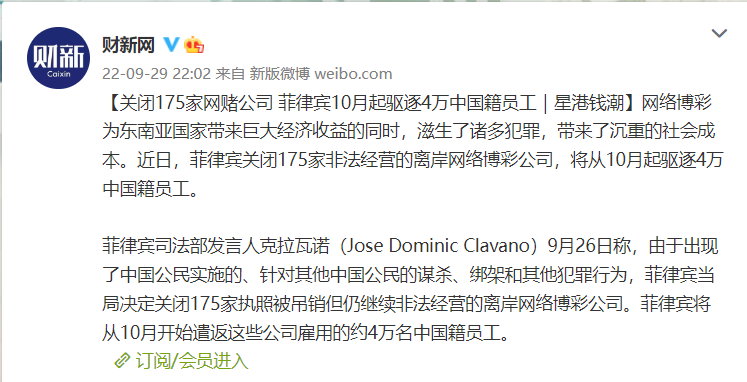 根據法新社的報道,菲律賓司法部長雷穆拉最近發出命令,要求菲警方追查175家執照被吊銷但仍繼續非法經營的離岸網絡博彩公司。菲司法部發言人克拉瓦諾27日表示,將從10月開始遣返這些企業僱用的約4萬名中國籍員工。