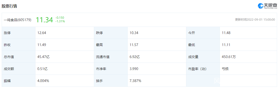 而後,雖然在6月30日短暫抬升至14.14元,下一個交易日7月1日又被打回原形,以5.53%的跌幅跌回12元以下。通過天眼查就能看到,截至9月1日,剛剛發佈2022年中報後,一鳴食品的股價又出現了新一輪下跌,以11.34元收盤,跌幅約為1.31%。
