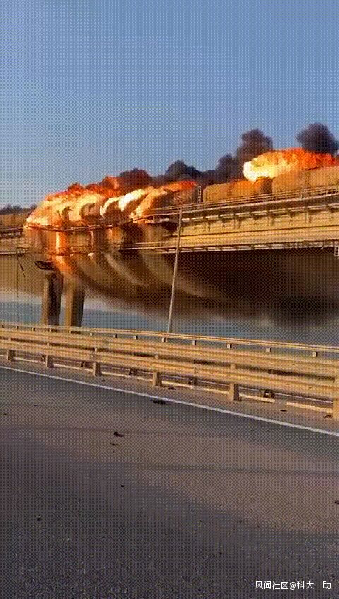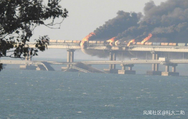 目前,克里米亞的刻赤海峽大橋已經關閉,俄方還緊急啓用了跨海輪渡,刻赤海峽的航運是正常的。油罐起火的貨運列車的車頭,以及部分車皮已經被拖離克里米亞大橋,但油罐車還在克里米亞大橋上燃燒。