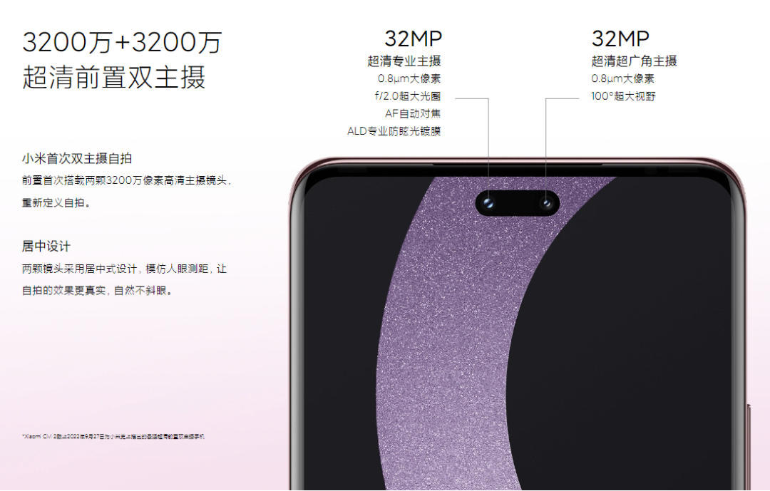 為了繼續拉開與同檔手機之間的前攝自拍效果差距,Civi 2的兩個前置攝像頭(主攝+超廣角)都達到了3200萬像素,主攝的AF功能得到保留,還升級支持f/2.0的大光圈,物理景深效果更加自然。再輔以雙色温微縫柔光燈,可實現多人合影調節和單反級人像虛化,結合肌膚煥新技術3.0,呈現真實質感人像。後置鏡頭模組的設計類似小米12,主攝升級為大底的索尼IMX766。