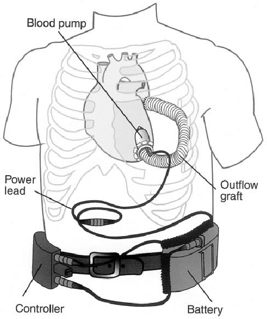 在他的心臟裏,有一個拇指大小的電子泵,晝夜不停地把他左心室裏的血液抽空,然後送進主動脈,如此循環。