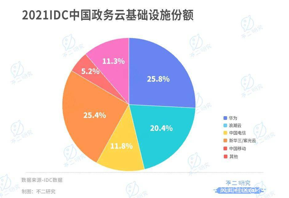 在佈局方面,華為雲優勢明顯,據IDC數據顯示,2021年華為雲在中國政務雲基礎設施份額中佔25.8%,斬獲第一。