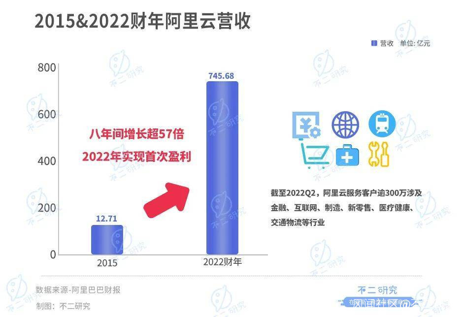 阿里雲的業績也佐證了阿里雲近年來的高速發展,據阿里巴巴財報顯示,阿里雲的營收從2015財年的12.71億元增長至2022財年(2021年4月至2022年3月)的745.68億元,八年間增長超57倍,並且在2022年實現首次盈利,在“四朵雲”中率先實現盈利。
